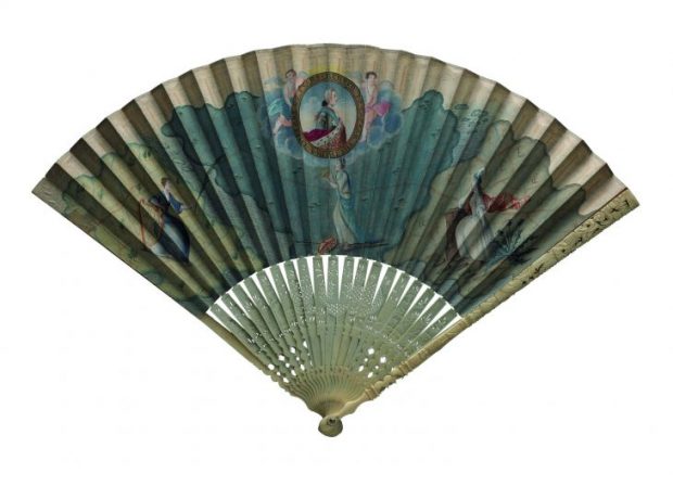Fan with a hand-painted leaf showing Prince Charles Edward Stewart surrounded by classical gods, (c. 1746), probably designed by Robert Strange, National Museums, Scotland