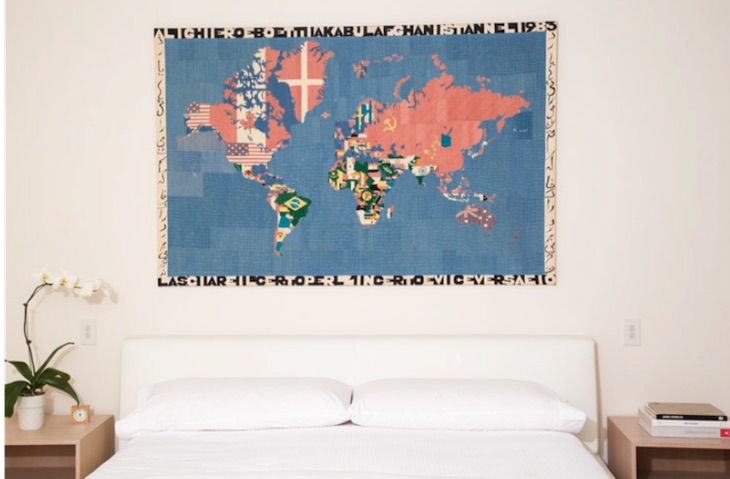 Lasciare il certo per l’incerto e viceversa (1983) by Alighiero Boetti hangs on a bedroom wall. Photo: Dina Kantor