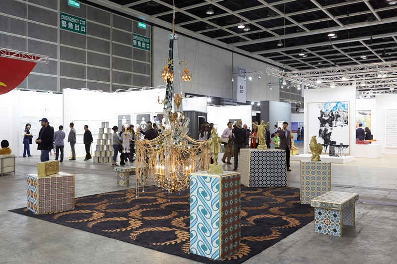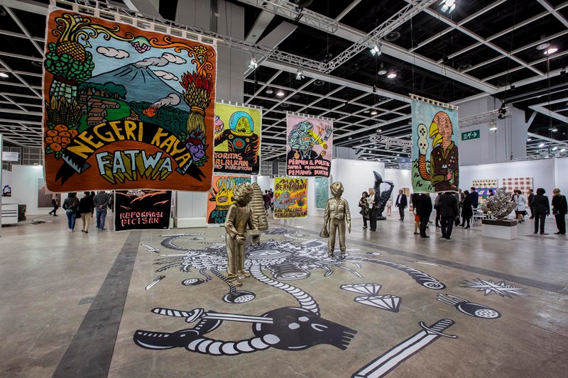 Besides the buying and selling, the major aisles or ‘meridians’ of the fair were dominated by a series of installations by artists from all four corners of the world, curated by Alexie Glass-Kantor from Sydney, Australia. Siobhán Hapaska’s tormented trees (UK), Eko Nugroho’s striking political banners (Indonesia), Sterling Ruby’s giant stoves (USA) and Dzine (Carlos Rolon)’s gaudily oversized chandelier as part of the site-specific installation Around the way (2013) (USA), were placed in dialogue with works by artists from China, South Korea, New Zealand and Malaysia.