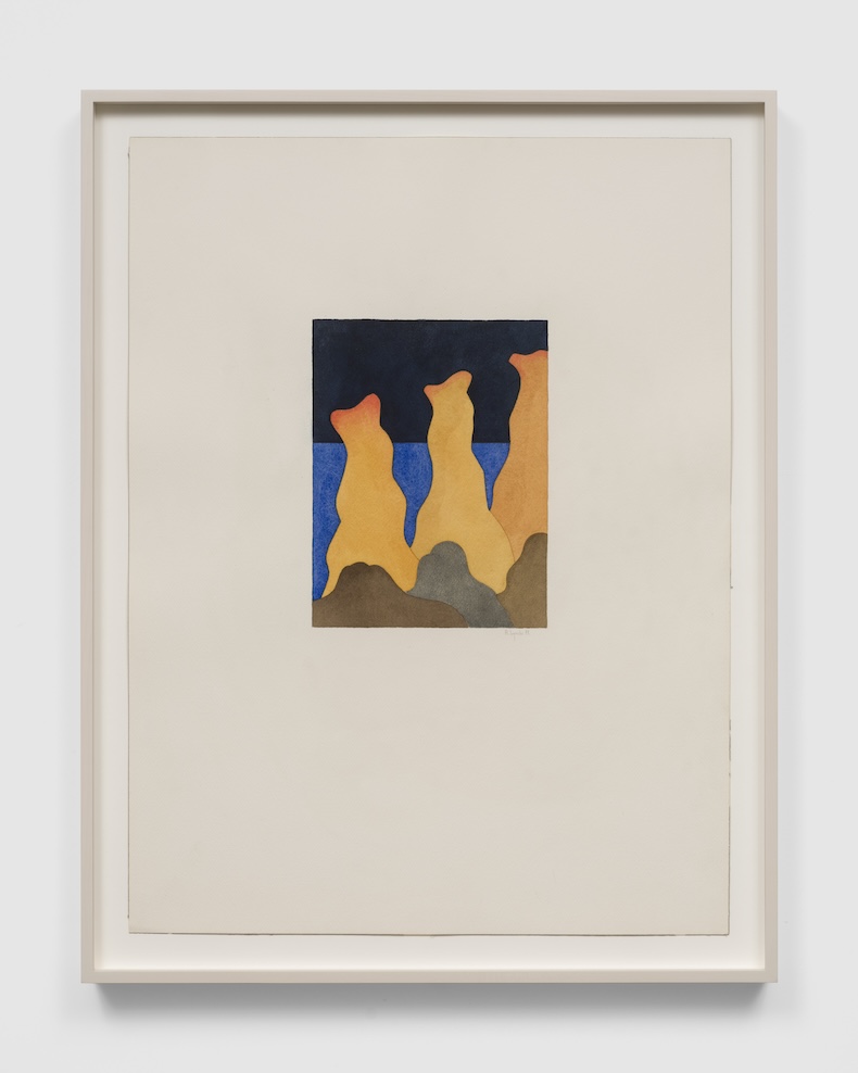 Throughout the 1960s, Lynch’s career sailed: he had solo exhibitions at the influential Dilexi Gallery in San Francisco and was included in group shows at the Whitney and museums abroad. To me, however, his art fully took flight only in the following decade, after he stopped exhibiting or selling it. From the 1970s on, he devoted himself to Zen studies, eventually being ordained as a monk. His watercolours from this period, such as those presented at Château Shatto made between 1975–77, are taut compositions, none bigger than a postcard, with generous white borders. They are more abstract than his earlier organic forms, with a lustrous glow thanks to his technique of layering washes of colour.
