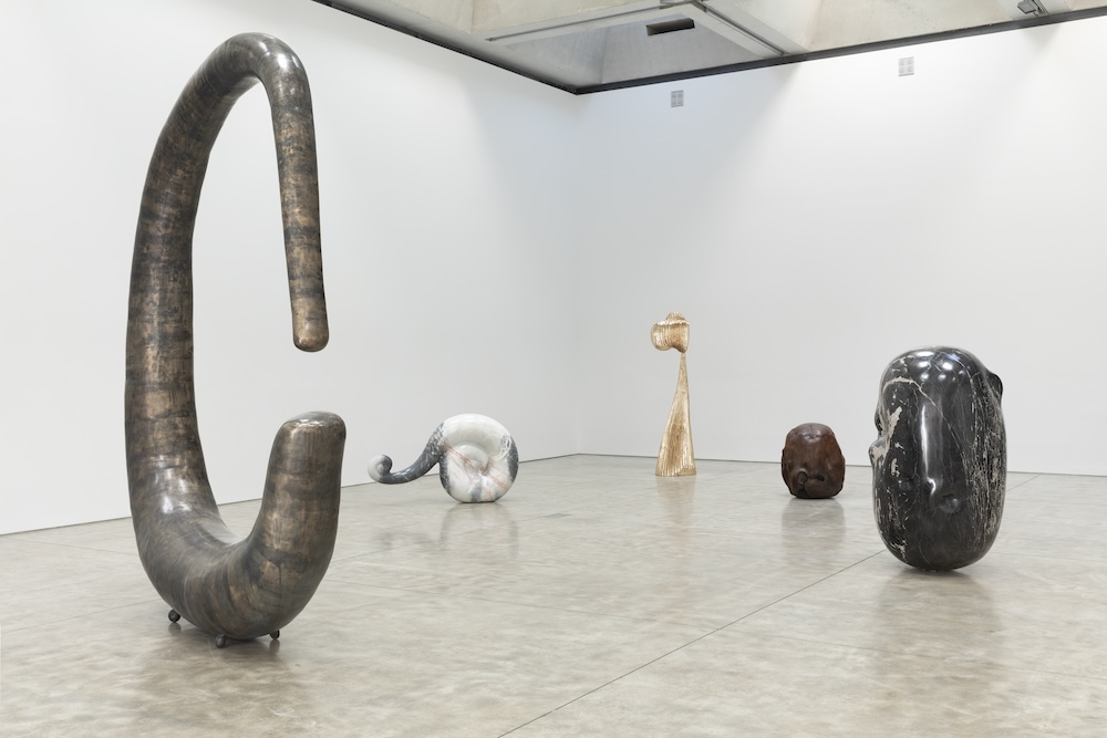 I first met Allen in his Joshua Tree studio in 2015. In his debut exhibition at Blum and Poe that year, I was amazed by his carved and polished abstract sculptures, in rich Claro walnut, black bronze or white Yule marble, which felt both organic and also glitchily digital. Allen’s sculptures can seem as if they have been poured out of one material and into another: a tall white stone ring that looks like it was formed palm-sized in playdough, or a hunk of wood shaped like a glob of cast metal, with the lugs still attached. Sometimes the vibe is cartoonish, hilariously so – as if Disney ears or noses or cactus paddles are sprouting from rocks.