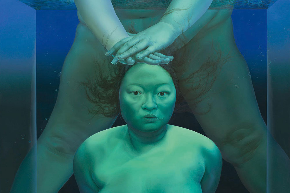 It Was Still Far Away was followed by a gallery of monumental paintings, each of which embodies acute psychological harm of one sort or another. The borders of Pruning (2025) are painted like strips of metal studded with bolts, between which Gordon appears, bound and naked, staring out from a tank of water, while a naked figure bears down on her head, keeping her submerged.