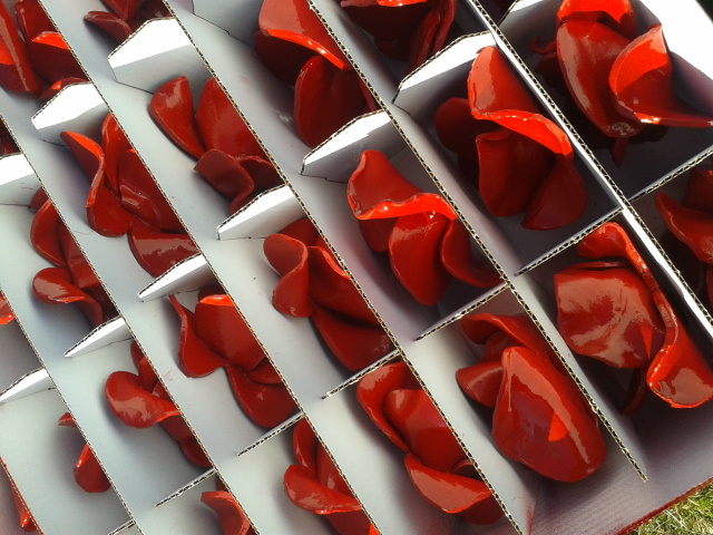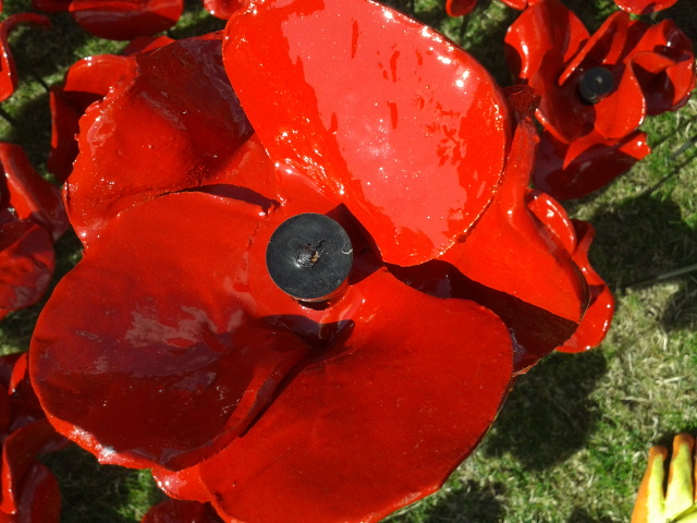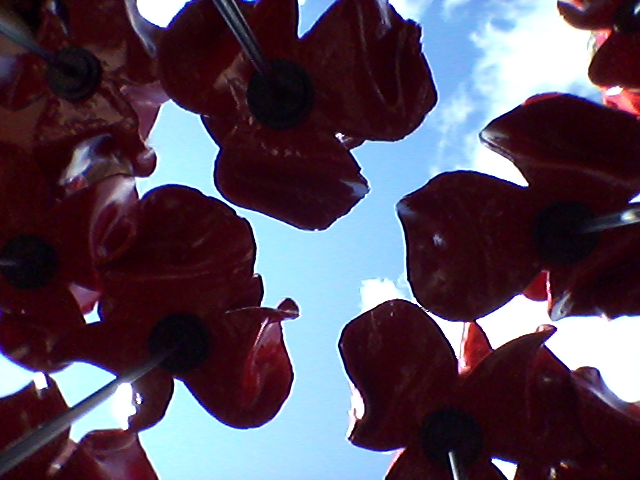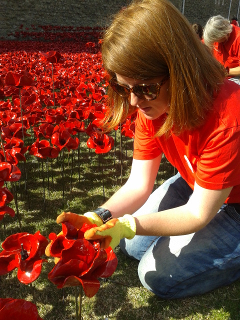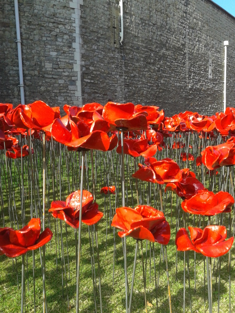 The process brings out the best cooperation and team work in a group of strangers. You put together the metal stalks with supporting washers, ‘plant’ them in the soil of the moat, and then carefully attach the ceramic poppy to the top. Volunteers are given complete freedom to extend the advancing wave of poppies in what curves and tendrils they wish. The physical exertion involved is both satisfying and reflective, as well as providing an added attraction for the Tower’s many tourists. I walked out of the Tower on a sunny Bank Holiday Saturday feeling strangely at peace.