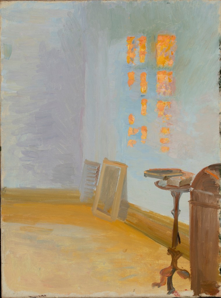 The light in these paintings streams in through windowpanes or shines bright through linen curtains but is best captured in pared-back studies such as Evening Sun in the Artist’s Studio at Markvej (c. 1913). This sketch-like painting, depicting a corner of Ancher’s workspace with a pattern of amber squares of light cast upon the adjacent wall and rendered in impasto, has become a totem of her practice, though she never exhibited the work publicly. Here it is hung frameless, its periwinkle hue standing out against the gallery’s flaxen walls. Nearby, Sunlight in the Blue Room (1891) shows Ancher’s young daughter Helga in her grandparents’ hotel; the vivid painting, with its inky blues and rich golds, was met with mixed reviews. One critic likened Ancher’s ‘attempt’ at the scene to the failed flight of Icarus. Nevertheless, Ancher’s handing of light, as made clear in four brief videos halfway through the exhibition, was the source of significant praise and she continued painting even when others suggested she focus on motherhood.