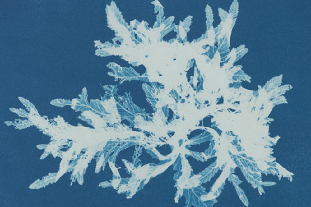 In 1839, Talbot presented his invention of the calotype, a method for fixing an impression on light-sensitive material. His early experiments used leaves and moss as subjects. The complicated technique was soon simplified by his friend John Herschel, who called his improved method the cyanotype: ultraviolet light turns an iron salt blue; on white paper, the parts not touched by light remain white. The technique was particularly suited to Atkins’ method of gathering and arranging botanical samples, under glass, directly on the paper.