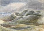 This balance between fluidity and tight design was not something I had fully appreciated in Nash’s work before, but it emerges clearly here as a stylistic preference curiously echoed in his choice of subjects. A remarkable number of the studies, for example, feature bodies of water. In his Dymchurch sketches jagged waves crash against an equally unforgiving sea wall with a violence that many have interpreted as reflecting Nash’s psychological state at the time (he suffered a nervous collapse in 1921). In a number of later landscapes the earth and sea seem to have resolved their differences: in Sea Wall (1935) they merge in a sinuous composition of muted browns and greys; Stone Sea (1937) traces the rise and fall of a dry stone wall over rolling hills; in Maiden Castle (1943), the ancient hill fort’s dug-out ramparts seem to break over themselves.