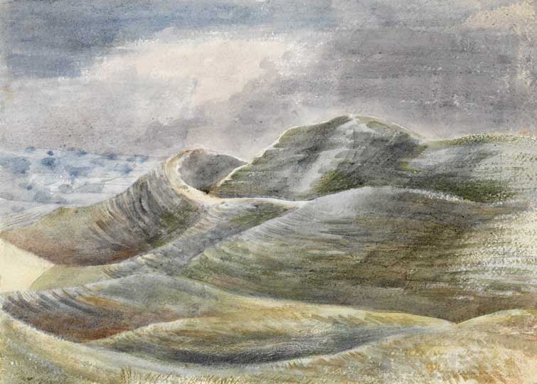 This balance between fluidity and tight design was not something I had fully appreciated in Nash’s work before, but it emerges clearly here as a stylistic preference curiously echoed in his choice of subjects. A remarkable number of the studies, for example, feature bodies of water. In his Dymchurch sketches jagged waves crash against an equally unforgiving sea wall with a violence that many have interpreted as reflecting Nash’s psychological state at the time (he suffered a nervous collapse in 1921). In a number of later landscapes the earth and sea seem to have resolved their differences: in Sea Wall (1935) they merge in a sinuous composition of muted browns and greys; Stone Sea (1937) traces the rise and fall of a dry stone wall over rolling hills; in Maiden Castle (1943), the ancient hill fort’s dug-out ramparts seem to break over themselves.