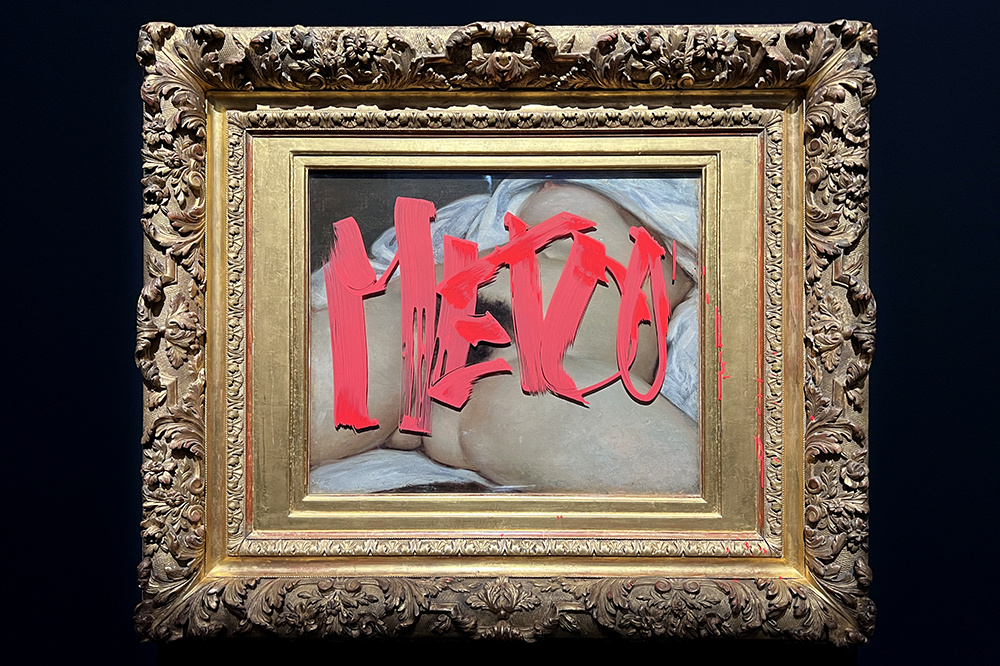 A group of feminist activists spray-painted Gustave Courbet’s painting L’origine du monde (1866) with the slogan ‘MeToo’ last weekend. The work, which is owned by the Musée d’Orsay in Paris but is currently on display at an exhibition at the Centre Pompidou-Metz, is a detailed depiction of a woman’s vulva. The painting is protected by glass. The Luxembourgish artist Deborah de Robertis has since claimed responsibility for the action, which she has titled On ne sépare pas la femme de l’artiste (‘The woman cannot be separated from the artist’) and which also involved the defacement of four other works on show. These included a photograph of the artist performing her own work Mirror of Origin (2014), which consisted of her sitting naked underneath L’origine du monde. Two women were arrested after the tagging, and French culture minister Rachida Dati denounced the stunt, writing on Twitter that ‘an artwork is not a poster to be coloured in with today’s message’.