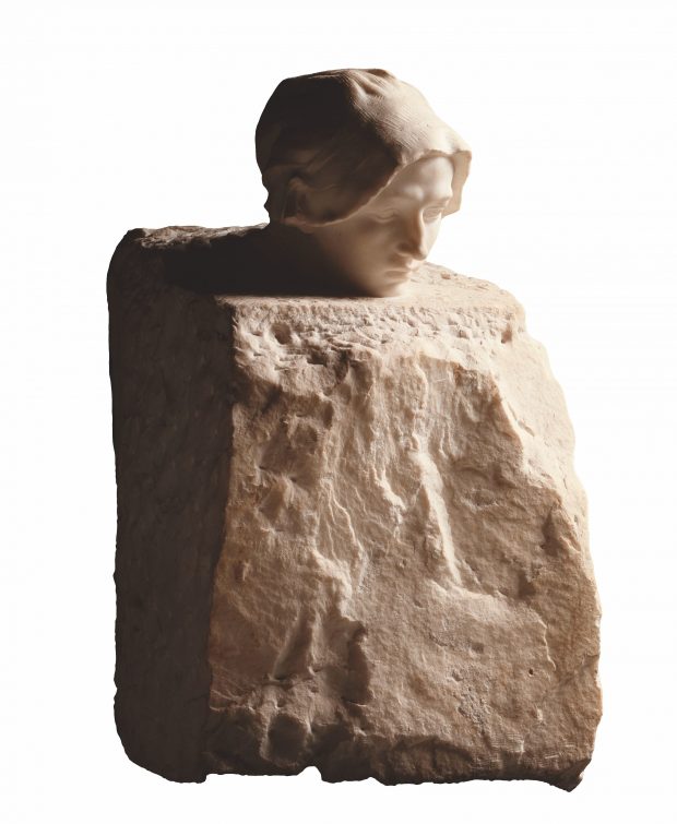 If it is the Parthenon’s inspiration we are looking for in the work of Rodin, we find it most explicitly in Pallas (Athena) with the Parthenon. Again this is a portrait, this time of Mariana Russell, the Cassino-born wife of the Australian Impressionist painter John Peter Russell. Rodin was one of the most sought-after portraitists in history, and portraiture is an art form more often associated with Rome than Greece: any beauty here is arguably Italian. Once this beauty is adapted to allegorical ends, however, its spirit is Hellenic, albeit a Hellenism that throws down a challenge rather than offering a solution. Like the mythological heroine Niobe who is turned to stone, Mariana’s face emerges from the rock, her roughly hewn hair doubling as the Athenian Acropolis on which the Parthenon sits. Whereas Athena is born fully armed from the head of her father Zeus, an event captured on the east pediment of the Parthenon, here it is the Parthenon itself that appears. The temple was consigned in antiquity to function as the container of the colossal gold and ivory statue of the goddess inside it; now Athena, or the wisdom she personifies, contains the temple. Rodin has turned the classical inside out, concentrating years of detailed drawing into an ideogram.