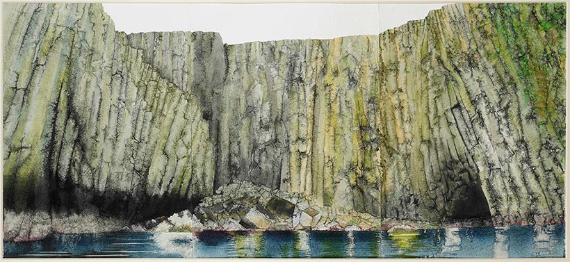 Next to the cosmopolitan cool of the ICA and in the shadow of national and royal collections at either end of the Mall in London, Jill McManners’ watercolours of the Shiants – a group of remote volcanic basalt islands in Scotland’s Outer Hebrides – look compellingly out of place. The artist’s solo exhibition at London’s Mall Galleries (organised by Thomas Lighton of the Merville Galleries) is the result of over six years painting and drawing the islands’ forbidding cliffs, whose pillars thrust out of the sea in impenetrable formation, chilly with damp lichens and painted at the water’s edge with otherworldly mineral colours.