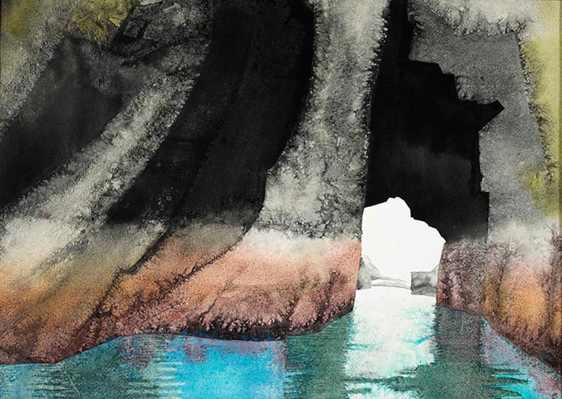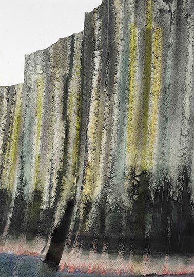 McManners’ watercolours have a strikingly sculptural quality, particularly for what is so often considered a lightweight medium. Their painted impact is hard-won: working on thick, textured Italian paper, she layers numerous washes of different transparencies onto the surface, scratching out highlights, lifting areas of paint and building up deep, impenetrable areas of indefinable near-black. Her titles are either architectural (cathedrals, curtain walls and buttresses) or musical (she works to rock music, and quotes her favourites), and suggest the spiritual and personal impact of the islands on her life and work.