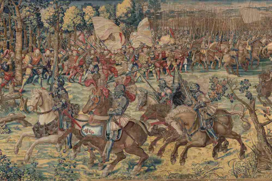 The Advance of the Imperial Army and Counterattack of the French Cavalry Led by King Francis I (detail; c. 1528–31), Willem and Jan Dermoyen, after Bernard van Orley. Museo e Real Bosco di Capodimonte, Naples