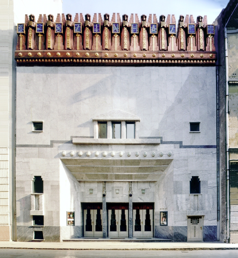 The proto-deco Parisiana nightclub is something else again. Its sheer façade of subtly veined white marble has openings inflected by Lajta’s studies of Assyrian architecture. The cleaning and restoration of the building in 1991 caused consternation – peeking out of a backstreet opposite the grand opera, it seemed to embody a theatrical kitsch. The flat façade looks like architectural greasepaint, its coloured highlights a garish affront to the grey city streets. Yet even here the stepped entrance doors echo ancient models and seem to refer to the Aztec forms that would so preoccupy American architects two decades later. But look up top: angels in the architecture. The frieze is an array of stylised angels, each holding a letter of the theatre’s name. There’s a hint of Otto Wagner here, but also a foreshadowing of Wim Wenders’ film Wings of Desire, the benevolent urban angels looking wistfully down on to life of the streets below.