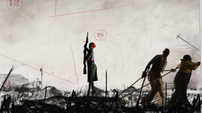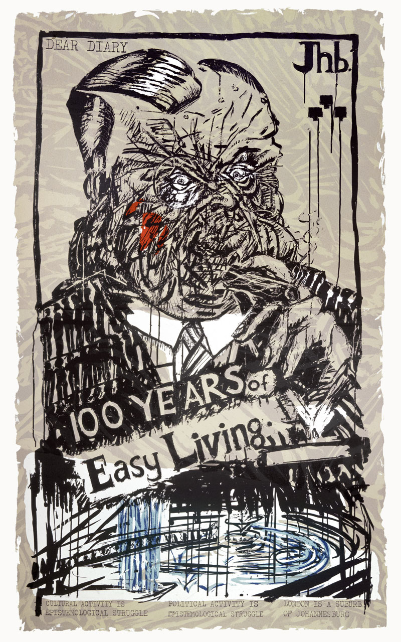 Perhaps one clue to Kentridge’s appeal today is that, as suggested by his triptych of large-scale screen prints entitled Art in a State of Grace, Art in a State of Hope and Art in a State of Siege (1988), he makes work for our besieged times. ‘I never thought of them as setting an agenda for the next 30 years of work. But in some ways they have and they did.’ He continues, ‘Art in the State of Hope referred to the political art of the constructivists, of the early Soviet era, where art and utopian thinking would sit comfortably together. Art in a State of Grace was art retiring from the world into a condition of beauty, if you think of the Matisse cut-outs, and those gorgeous paintings done during the Second World War. That was another kind of thing, which I longed for, but which was impossible.’ Instead, born into the last violent phase of colonial power in South Africa, he has devised an Art of the State of Siege, ‘where all the ambiguities and uncertainties are present, but it is not a retreat from the world nor a triumphalist confidence in the way the world will unfold.’ Certainty, as he sometimes remarks, leads only to the Killing Fields of Pol Pot.