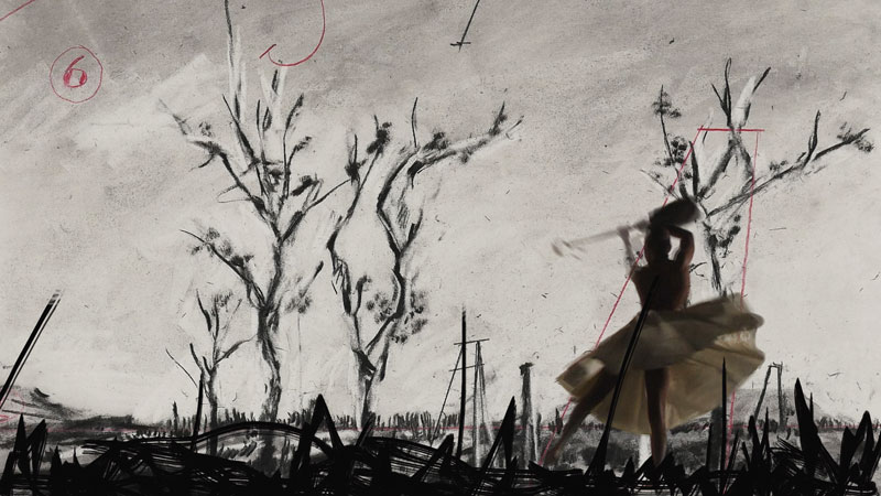 Today, I am in the dark, in the auditorium of The Muziektheater in Amsterdam, home of the Dutch National Opera. The South African artist William Kentridge is directing the first full dress rehearsal of Alban Berg’s opera, Lulu, a co-production with The Metropolitan Opera, New York and English National Opera, London. While Lulu behaves badly in a series of brightly lit sets denoting her various homes – running through husbands, borrowing their clothes, unable to fulfil her lovers’ obsessions or find in them what she is seeking – Kentridge’s team project on to the stage an evolving series of black drawings, lined with thick paint, and sequences of old and new film footage. Drawn portraits of Lulu or her husbands fall apart; sumptuous bunches of flowers disintegrate; text and buildings are projected and then disappear, and there is black-and-white movie footage, as if from the days of silent cinema, of Lulu in prison for the murder of her third husband, and then contracting cholera. These crude, unstable, insistent, monochrome images point beyond the stylish scenery and colour-coordinated costumes, to the fragilities and obsessions that drive the plot to its tragic conclusion. ‘One has to think of the black ink as blood,’ Kentridge explains to his team, ‘and the brush mark as a dagger stroke.’