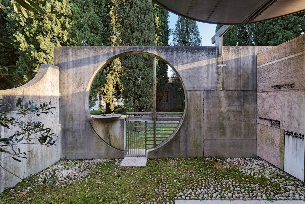 Here Scarpa created a landscape of memory, a capriccio of concrete in which the ground is seemingly excavated to reveal pools and streams. From the mosaic-rimmed interlocking rings that frame its most memorable moment to the concrete canopies that provide shade and shadow, right down to flashes of gold and shafts of sunlight, this is a complex ostensibly about death, but actually about discovery. There is very little like it, though Paolo Soleri’s unsettling desert utopia at Arcosanti in Arizona cleaves closely to its architectural inventions.