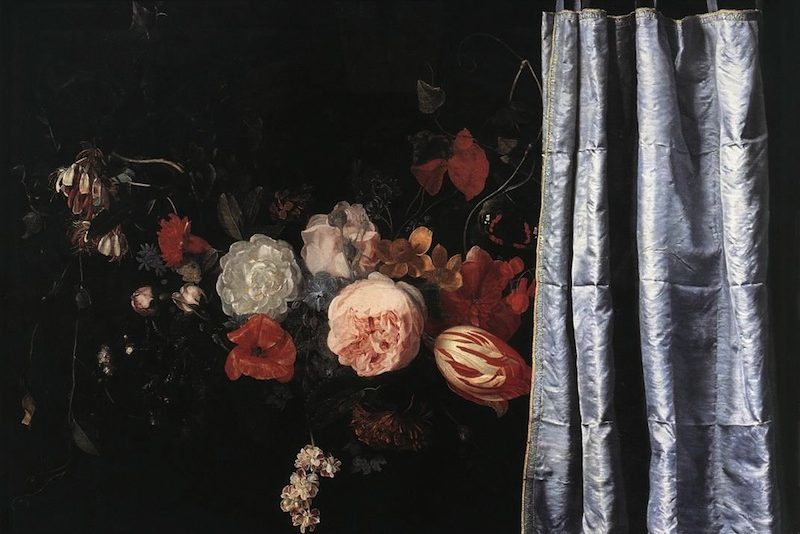 The effect of this, and of van Huysum’s insects, on the viewer of these paintings – on this viewer, at least – is not to create a sense of imminent decay, but rather to attract the eye to attend to surface and complexity, to examine not separate objects but the worlds they make up in microcosm. It dissolves still further the independence of flower and fruit, making them a sequence of variegated textures. To be the fly at van Huysum’s feast means to attend to the upholstery of the peach; to be the ant is to negotiate the crepe-like tissue of the carnations, to sink in the succulence of the deliquescing plum. In the schists and schisms of Peeters’ cheese, passages of apparently realist paint become landscapes of potential vitality. The still lifes offer up a fractal world, revealing the strangeness and complexity lurking in the familiar. Even the slowest of these food paintings depicts a life that is anything but still.