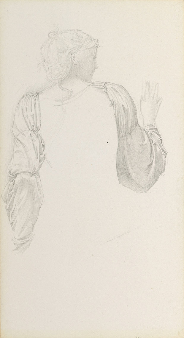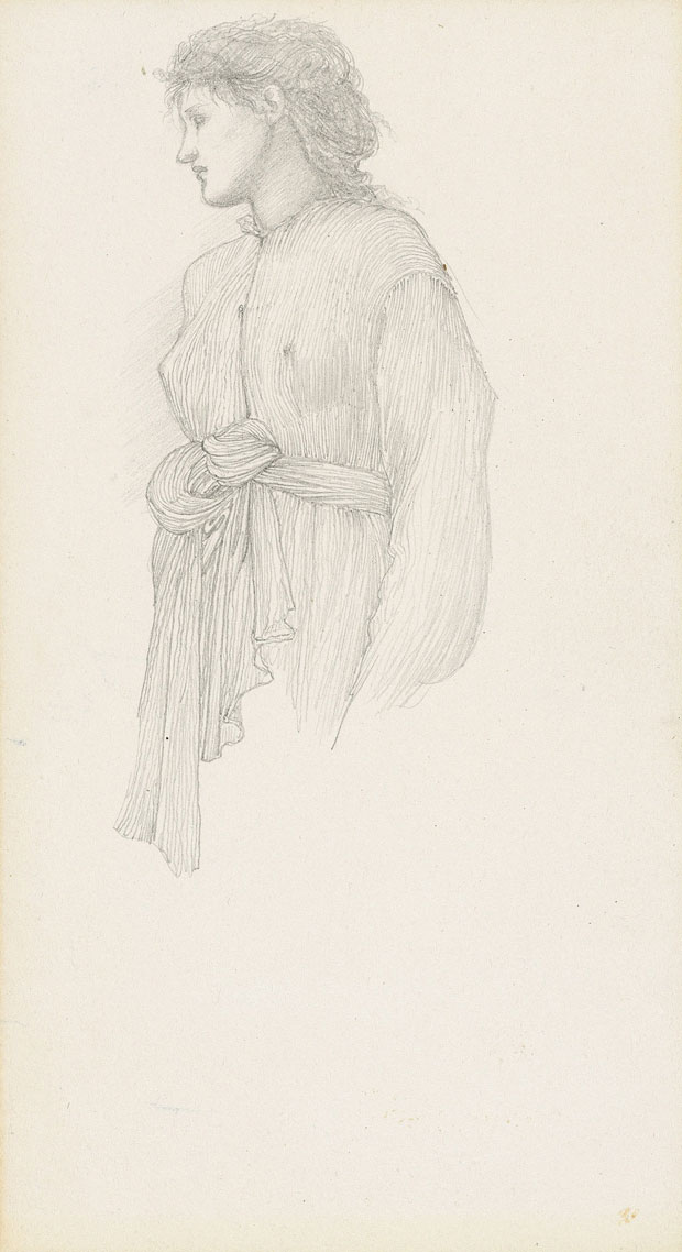 These highly finished studies find Burne-Jones at this most Botticellian, and favouring a hard, silvery pencil to delineate the minute pleats of the Fortuny-like gowns that he had made as costumes. (Stephens, however, noted the artist’s debt to Piero della Francesca, whose frescoes in San Francesco in Arezzo the artist had copied in 1871.) They are concerned primarily with the hang, movement and twist of drapery in the body and sleeve, the breasts revealed under the diaphanous fabric. According to Drummond: ‘It is incredibly unusual to find so many drawings together.’