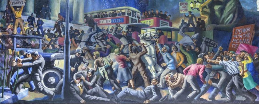 There were also large murals in a broadly socialist realist style, including Jack Hastings’s The Worker of the Future Clearing Away the Chaos of Capitalism (1935) at the Marx Memorial Library in Clerkenwell, London. Hastings worked in fresco to produce a striking work, bold in its use of colour and reminiscent of the religious iconography associated with the medium. Friend finds it a ‘somewhat lumpen homage to [Diego] Rivera’ (with whom Hastings studied), but it is a remarkable piece; its amateurism cannot fully suppress the epic scale of its revolutionary ambition. Outsized figures of Marx, Engels and Lenin, joined by English radicals Robert Owen and William Morris, flank the idealised revolutionary worker of the future, who sweeps aside the rubble of the dying capitalist world.