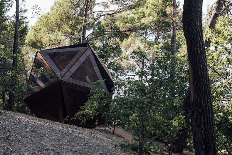 In 2020 he installed Schism at the Château la Coste winery in Provence. Set among vines and skies, a sculpture can echo the expansive complexity of a great wine. When the estate’s owner, Patrick McKillen, commissioned Shawcross, ‘He asked for an architectural feel where you actually enter into something, you sort of find a hidden chamber or anticipate a realisation to come.’ The 6m-high Corten steel structure consists of 19 tetrahedrons, approximating a perfect shape, an icosahedron, but undercut by a chasm in its frame.