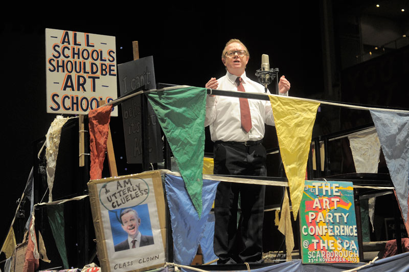 Back to school. Off to university. The beginning of September sees a return to order after the summer holidays, but have we got everything in the right order when it comes to education and the arts? Or perhaps a rather straitened emphasis on ‘good’ order – systems, percentages and hierarchies – is the main problem. On 21 August this year, to coincide with the announcement of GCSE results and the attending flutter of public interest around issues of UK education, art organisations across the country staged screenings of Bob and Roberta Smith’s film Art Party. The film documents, and fictionally embroiders, the artist’s Art Party Conference, which he called in Scarborough last year as a stand against Michael Gove’s plans to focus on a set of ‘core’ subjects which notably disregarded the creative arts.