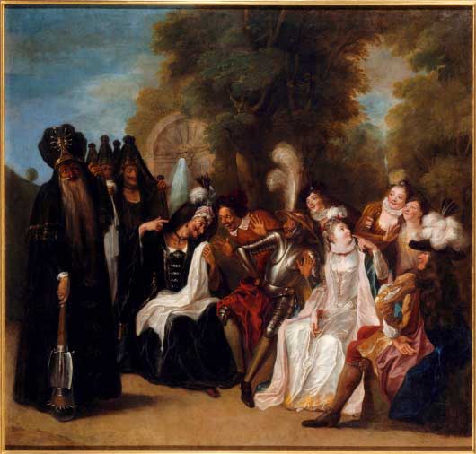 At the age of 18, Coypel himself wrote a play titled Don Quichotte. It was not successful, but several years later he gained some respect as a playwright with Les folies de Cardénio, a comic ballet in three acts danced by Louis XV at the château des Tuileries in December 1720. Coypel had evidently read Cervantes’ novel, but the selection and composition of his 28 painted scenes is likely to have been inspired by contemporary French theatre and ballet. What is the significance of his use of transposition between genres (from novel to play and ballet) and translation (from Spanish to French) in creating these scenes? How much has been ‘lost in translation’ from the original text? It seems to me – having studied these illustrations while reading the novel – that Coypel’s paintings are representative of a certain place (France) and time (the 18th century), while the novel itself is timeless. In Coypel’s scenes, Cervantes’ characters wear French 18th-century clothes, are shown in French 18th-century interiors, and are on the whole depicted in a charming style that emulates the artist’s contemporaries Jean-Antoine Watteau and François Boucher. The episodes that he selected – which focus on pastoral subjects like the inconstancy and folly of love, as well as the inevitable marriage of convenience – were both immensely entertaining and easily recognisable to a French 18th-century audience from numerous plays and ballets performed at court and in fairs.