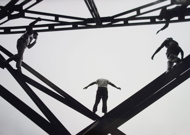 In one shot from 1972, a car has skidded to a halt following a crash, and a crowd has subsequently gathered around the mangled steel chassis in such a way that it seems the car skidded through the pedestrians, parting them until it couldn’t go any further. People look up intently at Metinides’ watching lens. In an image taken at Xochimilco Lake in 1960, another crowd has formed to watch a dead body being retrieved by a lifeguard. They can be seen in the reflection on the water, gathered along the shore. In a series of three photographs from 1971 the focus is on a figure balanced precariously, high up on the frame of a building under construction. The first image shows the figure alone, at the joint of some girders shown bold and black against the sky, like a Rodchenko or Renger-Patzsch print. As the images progress, two other figures make their away along the girders towards the central figure, who the caption explains had climbed up to jump to his death.