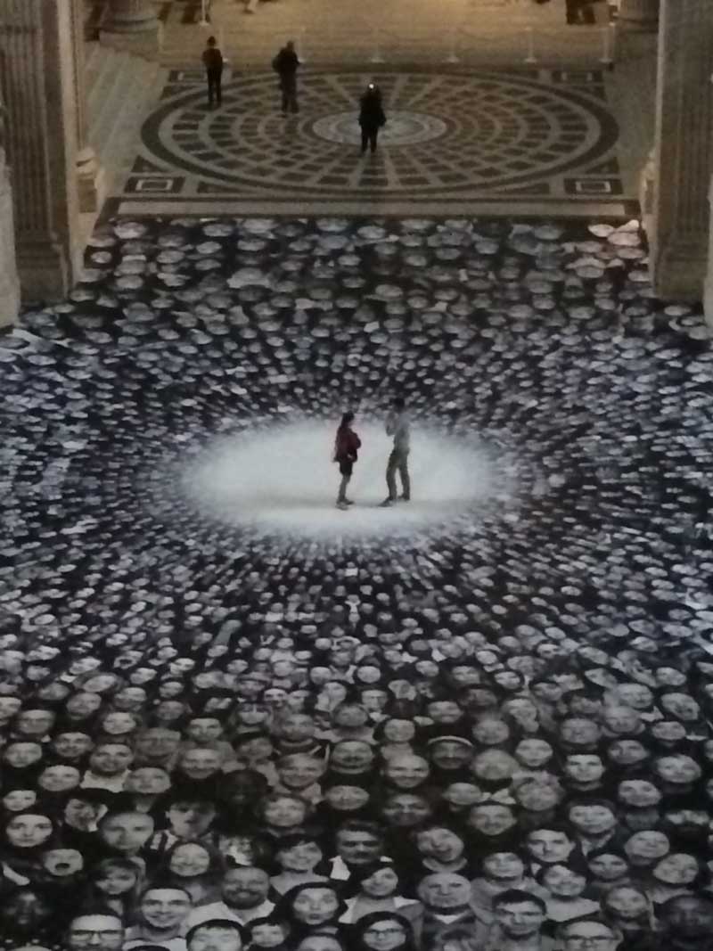 Au Panthéon is part of Inside Out, an ongoing participatory project inviting the general public to submit their own black and white portraits. It is tame compared with JR’s previous work but Au Panthéon still retains an element of cheeky provocation: bringing thousands of ordinary anonymous men, women and children into a monument which traditionally enshrines the great intellectual figures of French history (Pierre and Marie Curie, Voltaire, Rousseau and Zola, among others, are interred there).