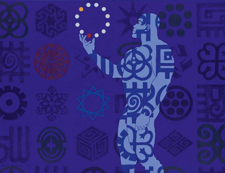 Over the course of five decades, Owusu-Ankomah, who died in February, developed a distinctive style of painting in which he covered his large-scale canvases with Adinkra – glyphs that in Ghanaian culture represent objects, feelings or ideas. Over time, Owusu- Ankomah began creating his own symbols and adding them to his paintings. This show includes works from 2008–14.