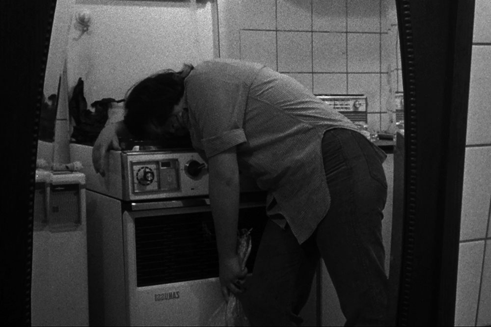 In Chantal Akerman’s first short film, Saute ma ville (‘Blow Up My Town’), the artist climbs the stairs of a tower block and enters her kitchen carrying a bunch of flowers. To a soundtrack of humming that slips between insouciance and derangement, she performs a sequence of eccentric actions. She prepares a bowl of pasta, forks it into her mouth with Neanderthal voracity then abruptly stops and offers the remnants to her cat. She slings the contents of a high cupboard on to the floor, then slops a bucket of soapy water over everything. She tapes over the gaps around the kitchen door while eating a pear. She dons the PVC raincoat and headscarf of a diligent femme au foyer and clumsily mops the floor. Akerman is infused with manic ennui – fleeting enthusiasms, changes of mood and claustrophobic listlessness. In the final frames she lights a sheet of paper, turns on the gas hob and tenderly lays her cheek on it. The screen goes black to the sound of an explosion.