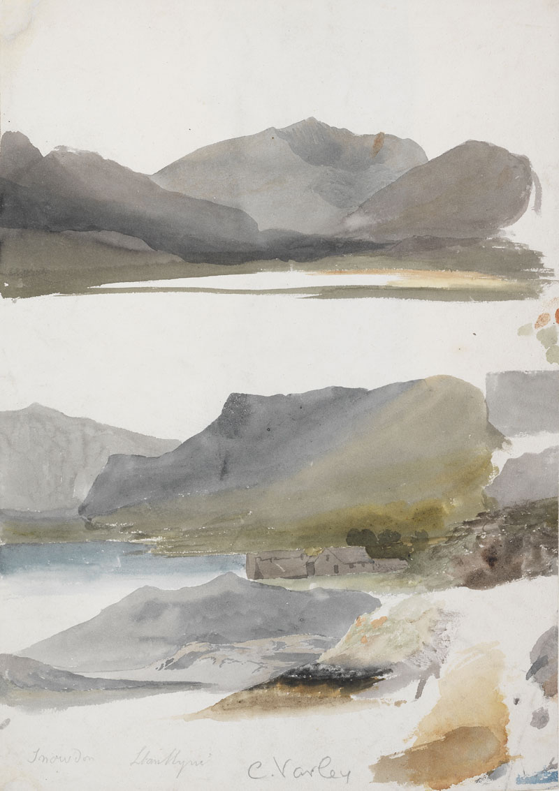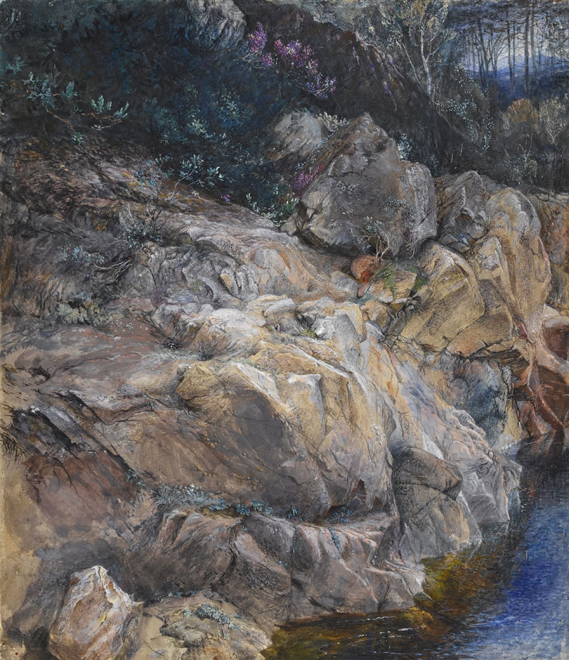 A display of pigments, teaching manuals, books of formulae for cakes of watercolour and paint-boxes reminds us, however, that it was the setting free of artists from the confines of the studio that drove the medium’s popularity. The middle section of the exhibition offers such highlights as Peter De Wint’s fluid Sketch of a tree and hull of a boat at mooring, as deft and dreamlike as a Chinese ink painting, and Turner’s tempest tossed Shakespeare Cliff (c.1825). Three Studies of Mount Snowden (c.1805), by Cornelius Varley, conjures the mountain’s masses with the thinnest of washes, just edged here and there with detail, while Ruskin notates every crease and crack of the rocks in In the Pass at Killiecrankie (1857).