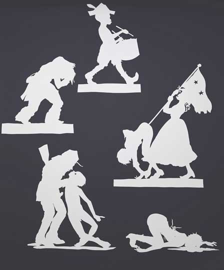 New to the collection, Walker’s large installation features a sampling of five white-paper silhouettes on a 12-by-12 foot black field. Typical of the artist’s work, the traditional 18th-century silhouette portrait form is turned on its head. Walker’s caricatures of Civil War era soldiers and slaves are depicted in vignettes of racist acts and sexual violence, behaviours that, unfortunately, continue to this day.