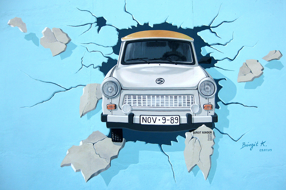Birgit Kinder’s mural, first painted in 1990 and repainted in 2009, captures a Trabant bursting through the Berlin Wall unscathed, symbolising the peaceful revolution that led to the fall of the Socialist Unity Party’s rule. Kinder wanted to create an image that could be instantly understood in passing, and chose the ‘Trabi’, an iconic and much-loved East German car. Click here to find out more.