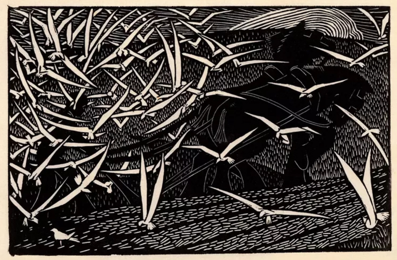 Spowers renders agricultural labour through linocut techniques, capturing the tensions between human effort and natural forces. The ploughman’s steady progress and persistence contrast with the chaotic energy of the surrounding birds. This emphasises the quiet heroism of physical work, where success relies more on patient endurance than on dramatic gesture. Spowers transforms back-breaking labour into a slow dance of complementary rhythms, celebrating the farmer’s fundamental importance. Click here to read more.