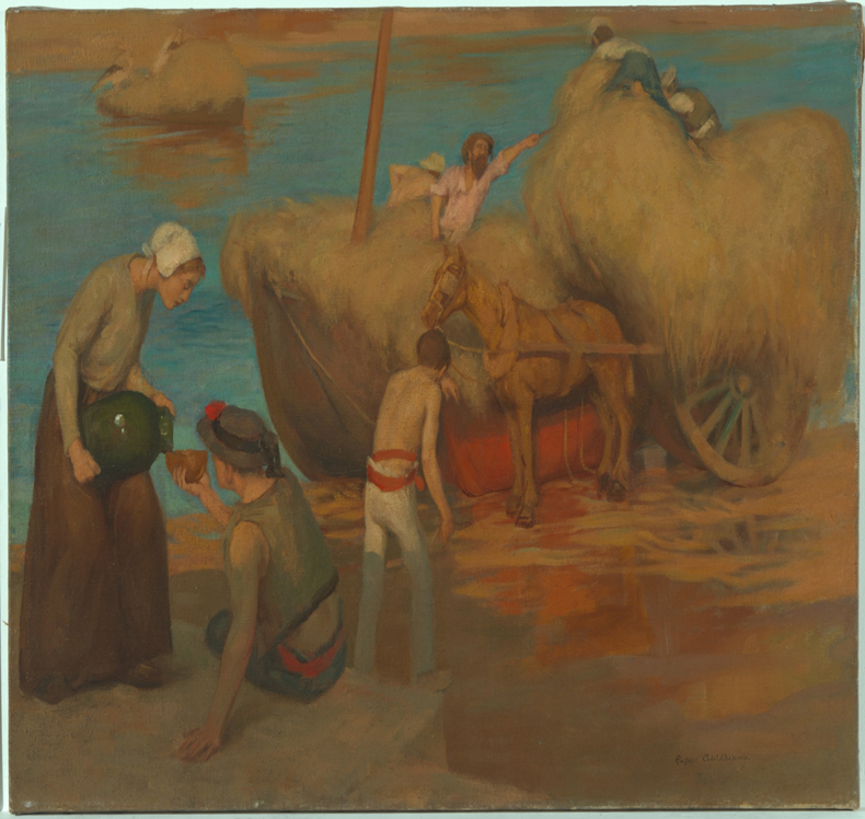 Bunny’s pastoral scene captures the harsh realities of the rural idyll as workers strain to move hay through Brittany’s waterways under an exhausting sun. His use of colour transforms documentary observation into emotional insights: a chain of bright red and vermillion connects the figure in the foreground to the boat that demands his arduous labour. The composition reveals multiple stages of fatigue and recovery, from the sheltered worker pausing to drink, to his sun-beaten colleague behind. Bunny refuses to romanticise rural labour, acknowledging the physical toll of work as well as its dignity. Click here to learn more.