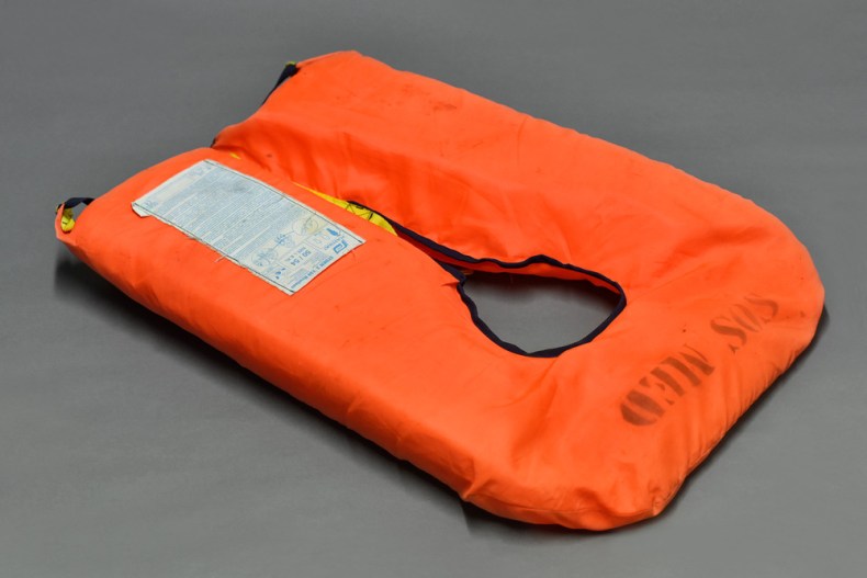 Life jacket from the Aquarius rescue ship, which operated between 2015–18. Photo: © EPPD-MNHI