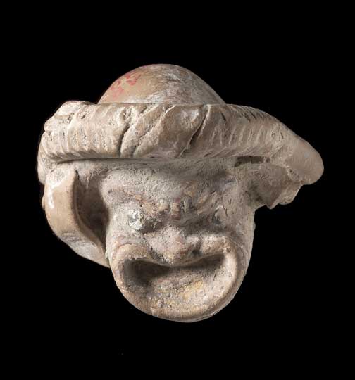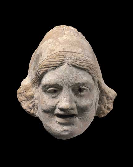 The final section is devoted to theatre and performance. Its main characters include the dramatists themselves (such as Menander, inventor of the ‘sitcom’, represented by a particularly fine bust) as well as the caricatured villains and protagonists from the plays themselves, each represented by their own distinctive mask.