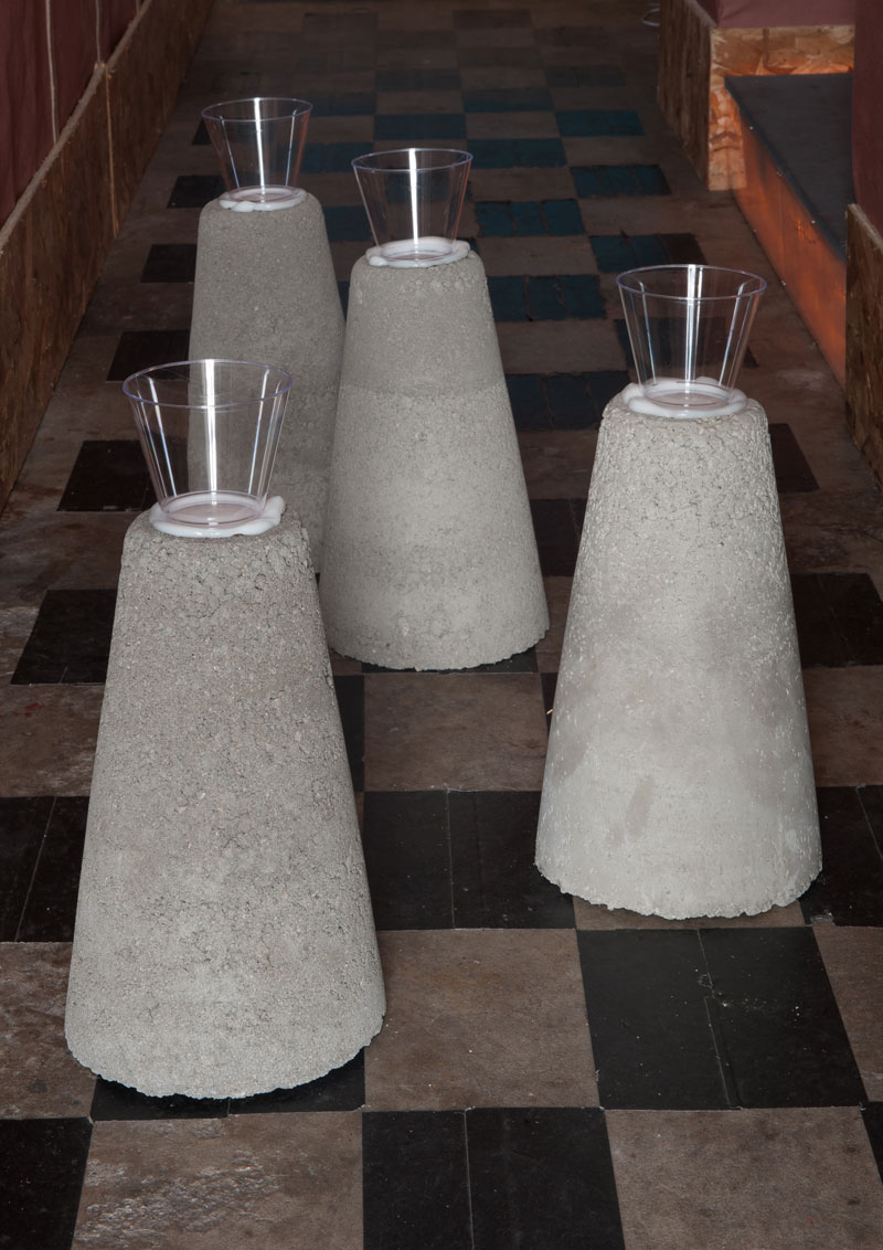 Los Bar, a project by Andreas Bauer, Christoph Meier, Robert Schwarz, and Lukas Stopczynski, is an almost-to-scale replica of Adolf Loos’s iconic American Bar in Vienna. It occupies one segment of a six-car garage in the Mackey apartments, designed by fellow Austrian modernist architect Rudolph Schindler. The original Loos bar is a paragon of refined simplicity: Loos’s attention to material finish and simple, boxy geometry created an intimate space replete with red marble, onyx, mahogany, and wraparound mirrors. The bar still earns its name with a steady jazz soundtrack, white-coated bartenders, and a menu of stateside classics like Highballs, Whiskey Sauers, and Manhattans. Los Bar doesn’t offer quite as many options – no cocktail muddlers or lemon twists here – but the artists do take turns serving gin, whiskey, tequila, vodka, and beer. For sturdier guests they’ll mix a kitchen sink combination of them all, delivered in a glass glued to a heavy concrete plinth.