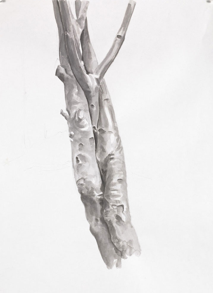 The vandals who presumably left the used cans in The Tree of Whatever (2015–16), the old tarpaulin in The Living and the Dead (2015–16) and the phallic graffiti in The Old Master (2015–16) had little respect for these trees. The same is not true of Shaw. Captured in a dingy twilight, his trees are not especially stunning, but the artist revels in the rich details of their branches; their texture, their crevices, and the twists of their unpredictable forms. His ink studies for Verso (2014) and Recto (2014) not only magnify their lumps and bumps, but also explore how the light subtly reflects off their bark. The trees in Study for Hanging Around (Landscape without Figures) (2014) have an ethereal quality, too. Set against a cool, pale sky, their leafless branches twizzle out with alluring delicacy. Shaw outlines the trees clearly, but he also allows long drips of ink to dribble down the paper, reminding us that this is a painting and these trees are unreal.