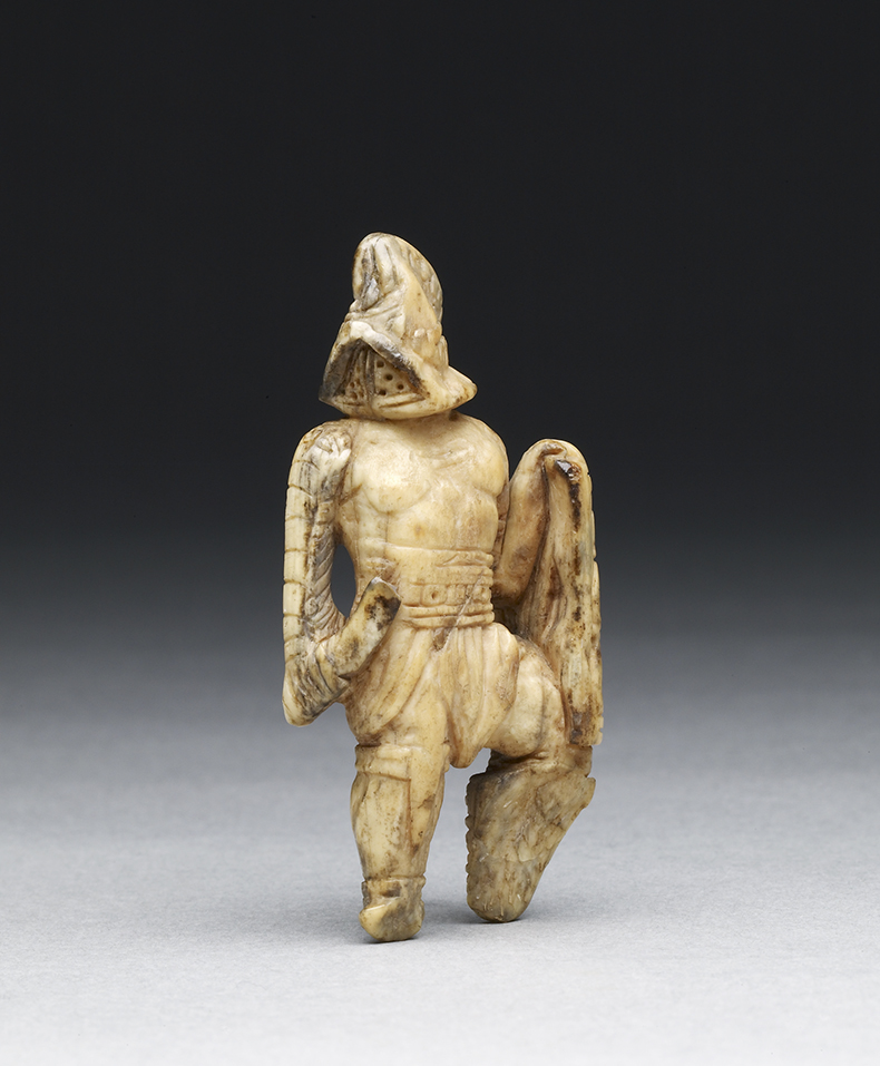 Bone figurine depicting a gladiator of the murmillo class, 1st–2nd century AD, Colchester. Photo: © 2024 The Trustees of the British Museum