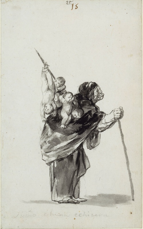 In 1793, when he was 46 and a successful painter at the Spanish court, Francisco Goya suffered a severe illness which left him profoundly deaf. While convalescing, he began to paint small pictures for private collectors, partly to recover his medical expenses and partly to regain his confidence and that of his patrons. He also began to make drawings in the first of what would become a series of eight private albums. These many drawings in brush and grey wash, occasionally retouched with pen and ink, accomplished between 1793 and his death in 1828, were uncommissioned work, shown only to friends, and full of a sometimes gleeful, sometimes savage subversive energy – by turns erotic, satirical or humorous. They were made alongside his official portraits and religious paintings and his groundbreaking series of etchings, including Los Caprichos, of 1799, and Los desastres de la guerra, 1810–1820. And while they share with the prints certain themes and preoccupations, the drawings have their own charged and delicate immediacy. Many had titles written in ink, and page numbers, indicating within each album a progression of ideas.