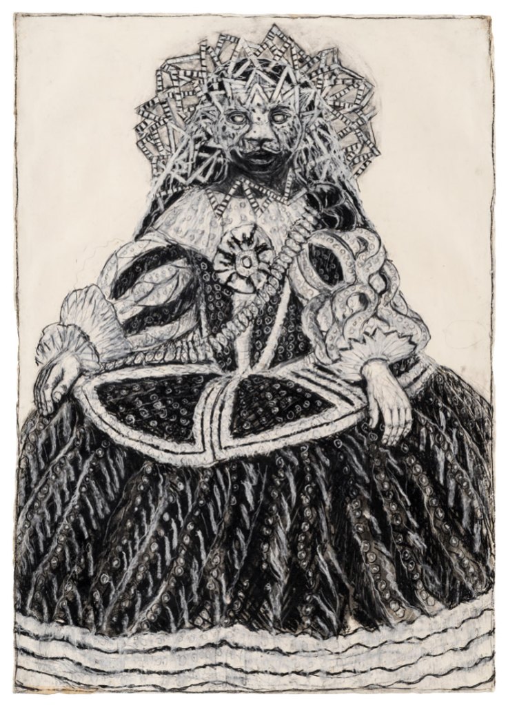 Describing something as ‘colourful’ or ‘vibrant’ can be a way of dismissing detail, of suggesting that an object or a work of art is not as serious as the sombre or monochrome kind. In a striking set of drawings made between 1996 and 1998, Locke seems to have worked through this problem by taking the subjects of European paintings and redoing them in charcoal and black and white pastels. The results are much harsher versions of, for example, the Infanta from Velázquez’s Las Meninas and Manet’s young fife player. They are harsher because they have been bleached of colour, yet at the same time more ornamented, every inch of their bodies and clothes covered in patterns of skulls, eyes and hands, among other motifs.