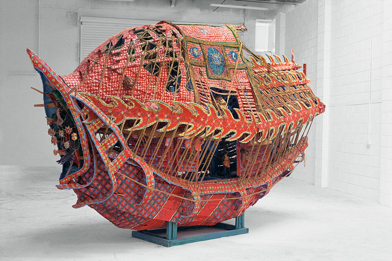 Locke’s first major work, Ark (1994), exhibited at his RCA graduation show, predates this period of germination and strength-training for the art-world savannah, but it was a remarkable statement of intent, inspired by sources that still inspire him, executed in unusual art materials – cardboard and papier mâché, even Locke’s work bench – and instantly pleasing to the eye. Ar is a boat with a puffer-fish profile, painted in a bright red and patterns Locke derived from Guyanese architecture or Indian miniature painting. Its immediate inspiration was an 18th-century model for an East India Company barge in Calcutta. It was well received, travelling to several UK venues but also, Locke felt – and this was true of his cardboard works from this decade – misunderstood as a work of folk art rather than sculpture, and conceptual sculpture at that. It was in the mid ’90s that Locke says that he stopped talking to people about Guyana to avoid questions about his work such as, ‘What carnival have you made this for?’