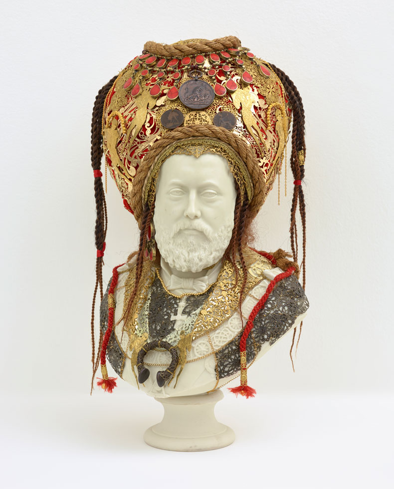 If the maritime works are among Locke’s most beautiful, it is his interest in the imagery of the British Empire and the visual manifestations of its power that hide in plain sight that have brought him to prominence. Perhaps Locke’s real achievement is to take signs of pomp and circumstance seriously, to reveal how surfaces can conceal. To make something plain is to be straightforward, to make your meaning clear. But the plain meaning of a monochrome statue or a bust tells us nothing except that the subject was once meant to be admired, and rarely for what reason. Locke’s Souvenir series (2018–ongoing) takes this idea to the point of absurdity by taking the busts of Victorian and Edwardian royals made of Parian ware (an unglazed porcelain that made for a cheap marble substitute) and covering them in baubles, replica medals and headpieces. Souvenir 8 (Edward VII in Masonic Regalia) from 2019 is a particularly attractive affair; with the sovereign’s medal- and jewellery-strewn headgear (which also sprouts dreadlocks) and splitting the difference between a crown and a turban, which seems appropriate for someone who was, after all, the Emperor of India.