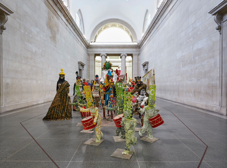 All of this happened early on in the pandemic. Although exhibitions can be a long time in the making and public commissions particularly slow to achieve, to casual onlookers, it might seem as if Locke’s career to date falls into two phases: before and after the pandemic. In recent years, an extraordinary string of exhibitions and commissions have raised his profile and brought his work in front of a mass audience for the first time. In March 2022, a large-scale installation piece, The Procession, occupied the Duveen Galleries at Tate Britain until the following spring, while in the autumn, four sculptures by Locke filled the niches of the Met’s Fifth Avenue facade for the best part of eight months. Later that year, four equestrian Ambassador sculptures were a highlight of the ‘In the Black Fantastic’ group show at the Hayward Gallery in London. In 2024, an installation called Armada (2017–19) formed part of one of the most appealing rooms in ‘Entangled Pasts’, an exhibition at the Royal Academy of Arts in London looking at how the institution’s own history has shaped ideas about empire and migration. Also in 2024, in ‘Hew Locke: what have we here?’ at the British Museum, Locke and his wife, the curator Indra Khanna, were invited to present objects in its collection relating to Britain’s imperial history in Africa, India and the Caribbean, together with new works by Locke.