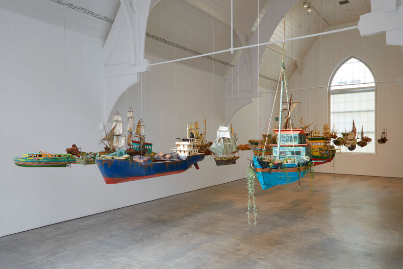 What has survived, however, is his enduring love of boats, which has expressed itself over the years in a series of installations, perhaps most memorably at the Folkestone Triennial in 2011. In a work called For Those in Peril on the Sea, Locke suspended 70 model boats in the vault of the ceiling of a parish church so that viewers could see only their hulls from below. In subsequent boat-based works with more attacking titles such as Armada, first installed at the Ikon Gallery in Birmingham, the models have been hung at a lower height, preventing the viewer from crossing the space they take up. In the UK, the words ‘small boats’ has, for some time, been a form of shorthand for asylum-seekers crossing the English Channel in the absence of less dangerous routes. When I ask Locke if the meaning of his small boats has changed over the years, he says he’s very conscious of the phrase. ‘I think of “small boats” as two different things. There are the small boats we talk about today, but then there are the small boats which went to get the troops from Dunkirk.’ And ‘armada’, he points out, is simply the Spanish name for a fleet; it’s the British, harking back to the failed invasion attempt of 1588, who have loaded the word with more negative connotations.