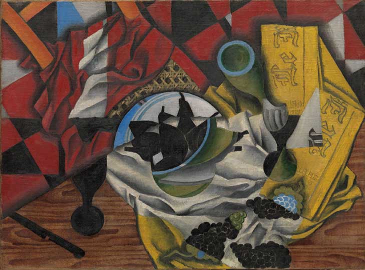 There was a fifth essential person: the visionary dealer Daniel-Henry Kahnweiler, who saw the possibilities of Cubism and championed the artists, his ‘pathfinders’. In 1908 he gave Braque a solo exhibition that included Trees at L’Estaque (1908), a systematic taking apart of naturalistic representation. Matisse famously called Braque’s work ‘painting made with small cubes’. Like the dealer Durand-Ruel before him, Kahnweiler nurtured his artists. He saw them daily, took them sailing, and offered financial support and international promotion. His practical help enabled Juan Gris to flourish and make Cubism his own, as in Still Life with Checked Tablecloth (1915). The year Léger signed on with Kahnweiler, 1913, he painted Houses Under the Trees with its billowing trees and pulsating forms.