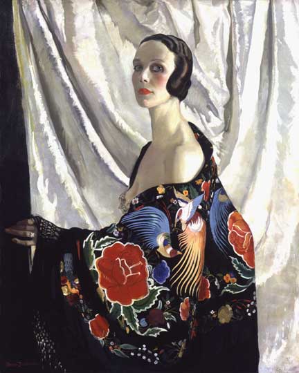 Two portraits of the sisters Anna Katrina and Doris Zinkeisen show contrasting aspects of feminine social identity. For Doris, it is all about style and cool aloofness in her 1929 self-portrait. Her shawl, with its exotic flowers and birds-of-paradise design, acts as a screen, betraying the defensive quality of her fashionable display. Anna Katrina, on the other hand, adopts a persona of wartime emancipation in her self-portrait from c. 1944. Hair tied back, sleeves of her overalls rolled up and a muscular forearm clutching her paint brushes, she is robust, dynamic and assertive.