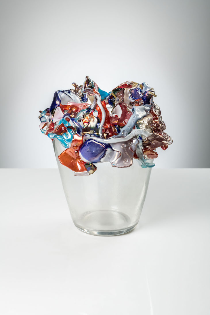 One striking early collection is the ‘Sogni Infranti’ (1992). These are transparent glass vases (or in one case, a fruit stand), to the top of which a carefully chaotic arrangement of polychrome ritagli (‘scraps’), rescued from Venini’s recycling boxes, has been fused, so as to suggest that they are melting into the surface.