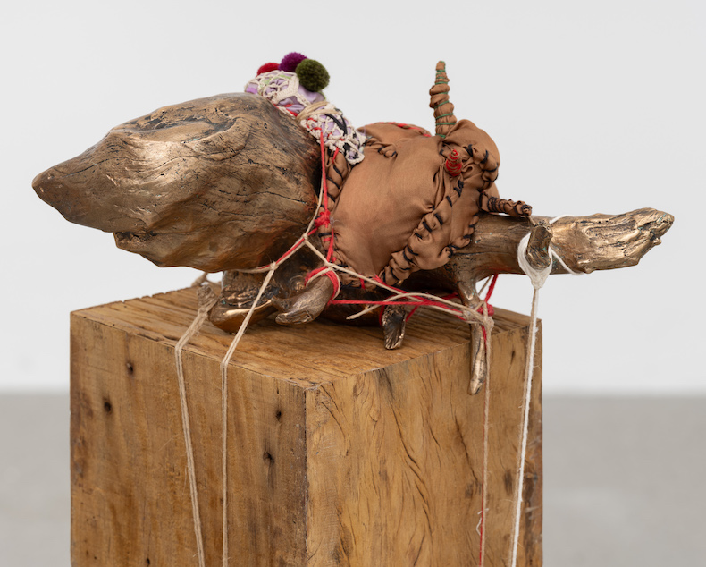 The Brazilian artist Sonia Gomes takes second-hand fabrics and other found materials – such as driftwood, furniture and birdcages – and turns them into amorphous sculptures that hang from the wall or dangle from the ceiling. Gomes has presented her work at two editions of the Venice Biennale and, in 2018, became the first Black woman to have a solo exhibition at the Museu de Arte de São Paulo (MASP). With an exhibition of her work at the Storm King Art Center in New York on until 10 November, Pace Gallery is now presenting Gomes’s first exhibition in the United Kingdom. Among the new works featured is Tereza (2025), which combines several of Gomes’s unfinished pendant works into one elongated form that stretches out through the space, and her first series of bronze sculptures, which have been cast from textile-wrapped branches and burls.
